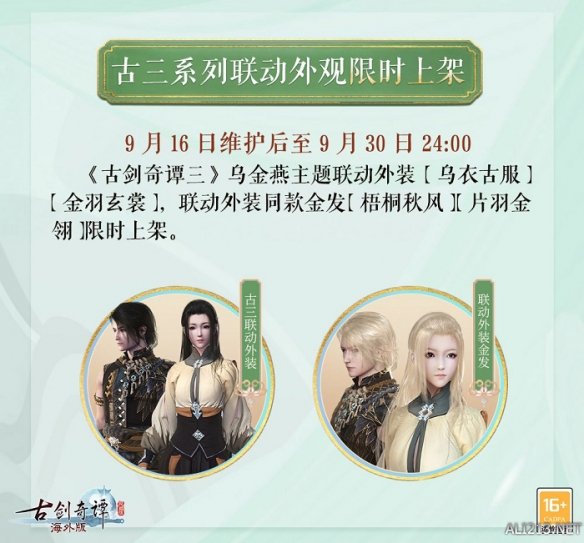 今日更新维护后至9月30日24:00,备受好评的《古剑奇谭三》乌金燕主题联动外装及同款金发将限时上架!喜欢的仙家弟子们可务必不要错过!