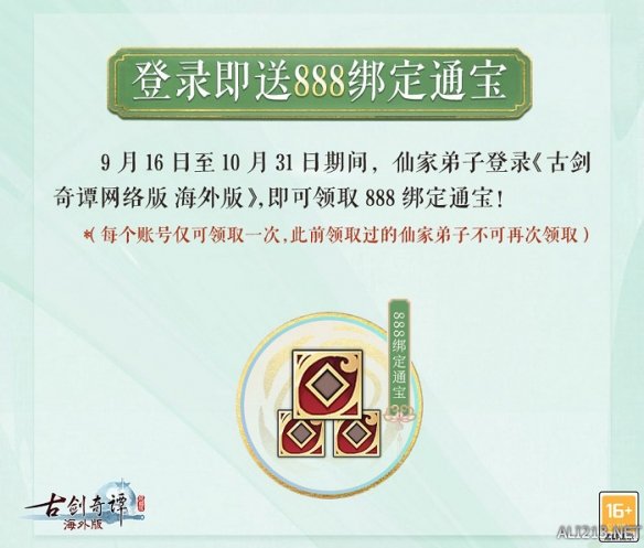 福利大放送!即日起至10月31日期间,仙家弟子们登录《古剑奇谭网络版 海外版》时即可直接领取888绑定通宝,快去登录游戏看看吧~