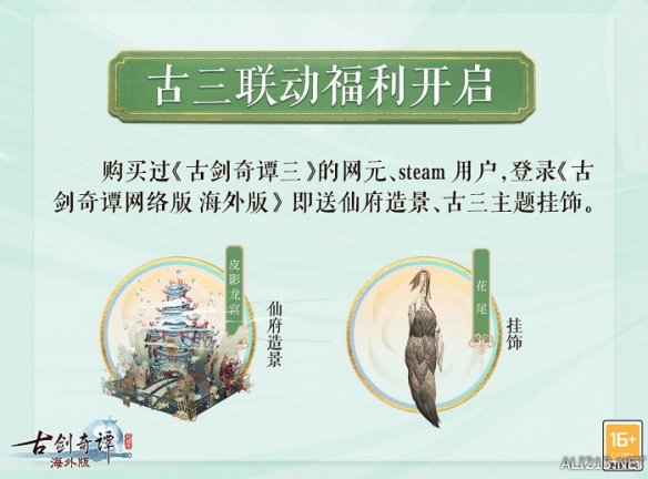 购买过《古剑奇谭三》的网元、steam用户,登录《古剑奇谭网络版 海外版》即送精美“皮影龙宫”仙府造景,以及精美古三主题挂饰。