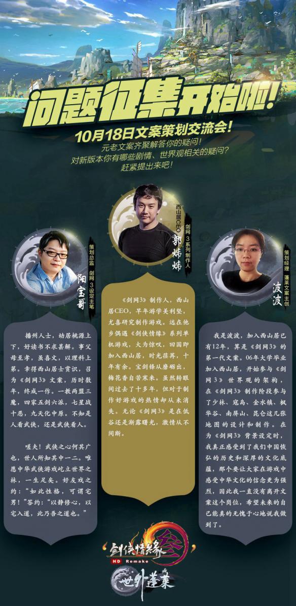 “鹰击长空,一梦蓬莱”《剑网3》全新资料片“世外蓬莱”即将开启,首轮测试开启在即,95级终极狂欢第二弹也将于即将上线》蓬莱剧情交流会也将于今晚20:00正式开启,届时将会通过全网进行直播!并由《剑网3》最初的剧情创作郭大侠、阳宝哥与波波带来蓬莱相关的精彩剧集,并对于侠士们所提出的部分问题进行解答。除此之外,万众瞩目的“大唐锦鲤”活动现已正式落幕,来自圣墓山的“大唐锦鲤”从63万人次中脱颖而出,让我们一同为这位幸运儿献上真挚的祝福!