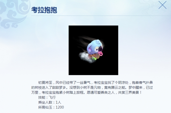 目前,“考拉抱抱”飞行祥瑞已经正式在游戏中上架,大家可以前往宝象国(57,25)的“桃源仙子”处花费1200仙玉将其收入囊中。据说这只考拉只是想找个阴凉处抱个树枝美美睡上一觉,但没想到它抱的小树却不是凡物,有着腾云之能。在考拉宝宝睡觉的时候,小树带它飞行万里,最终来到梦幻世界,遇到了三界当中的善良玩家。