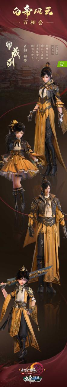 纯阳的“百相”套,选用颇具江湖意气的风格款型,于仙韵中透出潇洒之意!云纹刺绣中双鹤翩飞,透出到家遗世独立、超然物外的洒脱;而飘逸的墨色衣摆与金色衣饰相结合,则尽显江湖风范!