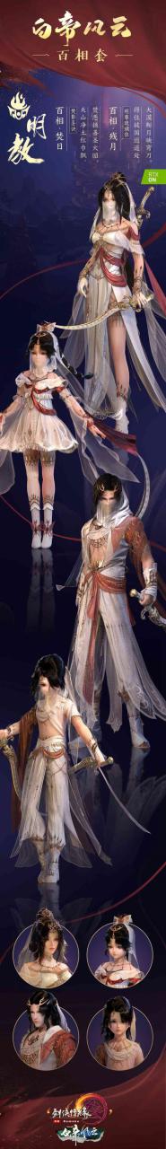 明教的“百相”套,通过圣洁的白色透纱与异域服饰相融合,搭配薄纱遮面,给人以梦幻缥缈的朦胧韵味!做点缀的金饰则采用烈日与圣火的样式,展现明教弟子的虔诚,而异域风情也随之更具张力,令人陶醉。