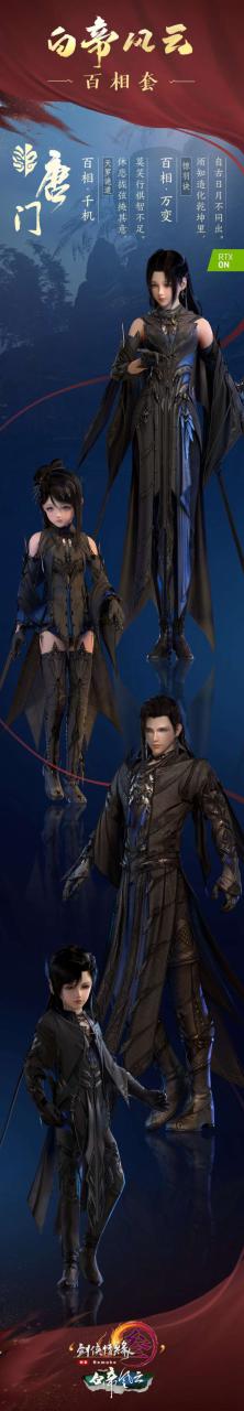 唐门的“百相”套,沿用墨色与深蓝的色彩搭配,服饰款型干练不繁复,给人以果敢决绝之意!衣摆与袖摆也秉持简约之感,配以雀翎和暗器坠饰,将来去无影的潇洒尽数体现!