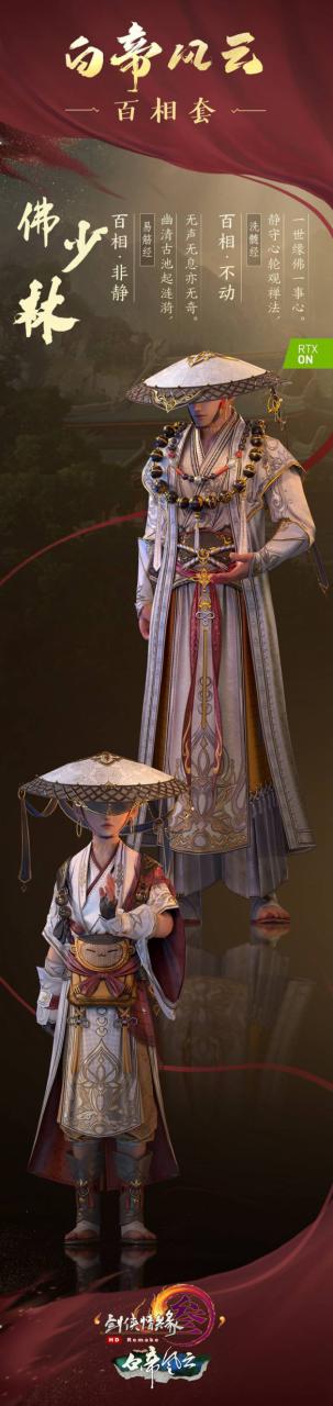 少林的“百相”套,以云游僧侣的服饰风格为基础,搭配佛教经典元素,莲花与火焰的纹饰给服饰整体带来颇具佛法韵味的不凡气度。斗笠与佛珠则给人以超脱红尘之意,体现追求禅理的至纯之意。