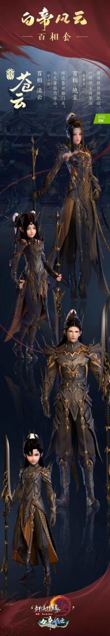 苍云的“百相”套,保留主体特色,去除繁复衣饰,使整体款型更加修身。鳞甲峥嵘加身,配以暗金色衣饰,与坚毅沉稳中透出杀伐之意,气势如虹!