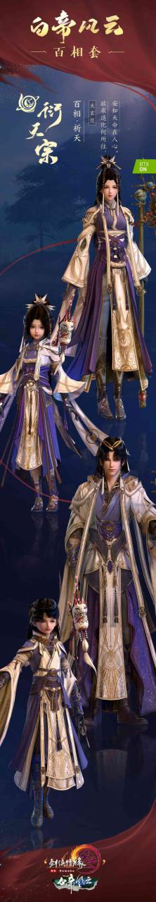 衍天宗的“百相”套,秉持衍天宗超然世外的款式风格,采用具有神秘色彩的紫色与米白色相互映衬,搭配金丝勾勒点缀,别具一格。衣衫暗绣星象纹样则增添了几分高深莫测、瑰丽梦幻的神秘感。