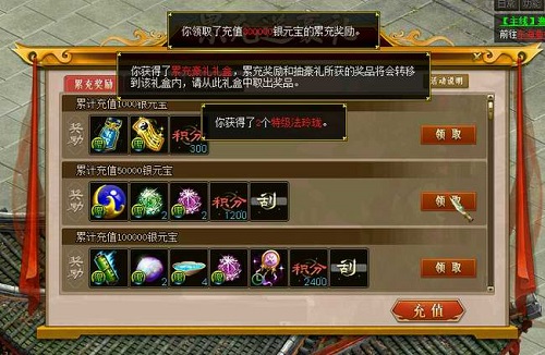 为了感谢各位道友对于新服“白虹贯日”的支持和喜爱,系统将在新服中开启累计充值回馈活动。当玩家在11月30日至12月20日期间,在新服“白虹贯日”累计充值达到10、50、100、500、1000、3000档位,即可领取该档位的回馈大礼包,并获得相应数值的豪礼积分。