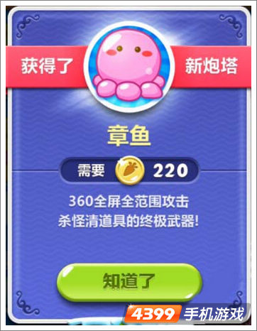 在保卫萝卜2中,除了在原来的炮塔上,还新增了许多炮塔,那些原本在保卫萝卜1的有些炮塔也进行了小幅度的变动,现在4399小编简木要为大家介绍的是保卫萝卜2章鱼炮塔图鉴。
