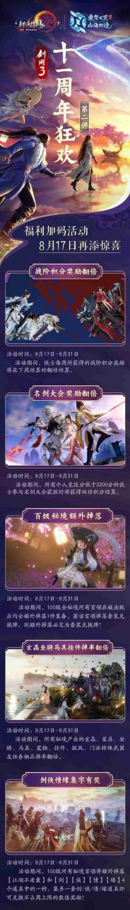 周年欢庆,惊喜加码!《剑网3》十一周年全民狂欢不停,第一弹福利现已上线,小橙武加速,日常奖励翻倍,还有“锦绣霓裳”周年特别版活动好礼多多!而资讯君今日也有好消息带给大家哦!十一周年狂欢第二弹活动将于8月17日隆重登场,全民福利加码,奖励惊喜翻倍,资讯君特为大家整理了一份攻略长图,话不多说,让我们一睹为快!