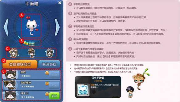 今日起至12月5日,接取<【活动】平衡喵的故事>任务,即能召唤出拥有基本特效的平衡喵,完成“勇敢”、“冒险精神”、“耐力”三大平衡要素的每日任务之后,可以领取对应的“平衡箱”、“平衡喵装饰效果”等基本奖励;完成每日任务达到一定次数之后,还能获得“平衡喵勋章”、“平衡喵伤害皮肤7天”、“平衡喵戒指30天”等对应的额外道具奖励。玩家还可使用“平衡喵装饰效果”,自由创造属于自己的平衡喵形象哟~另有<【活动】饮用甘甜的平衡饮料>任务可接取,完成之后就有机会收获“平衡喵脸饰(30天)”、“平衡喵帽子(30天)”等额外奖励。