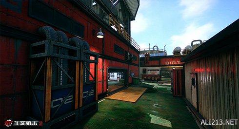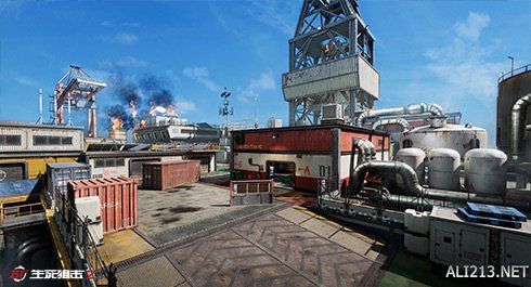 地图整体结构相较于3号矿区更为封闭且复杂,进一步保证阵营双方的对抗平衡性。场景四面环海、暗潮涌动,内部散乱分布着钻井吊索等作业器械、信号接收器及控制器、集装箱体与集装箱房,同索道楼梯一起形成了多层次的空间设计。各式掩体与弯绕小道,极大提高了对战的竞技性与趣味性。