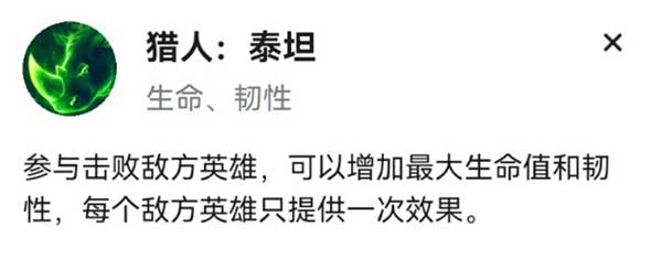 猎人:泰坦可以增加亚索的基础血量和自身韧性,提高亚索的存活能力。虽然说这个效果只能叠五层,但是只需要参与击败就可以叠效果,这在前中期发育可以让亚索有更大的优势,所以作为中单还是要多多支援上下路,哪怕是蹭助攻对你也是有好处的。