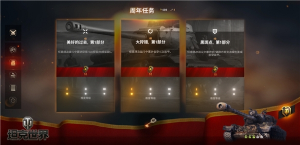 指挥官们可体验三种周年任务类型,要求您达成的目标分别为获得一定数量的基础经验、摧毁一定数量的敌方坦克和获得的经验排在队伍前7名之内。三种类型的周年任务分别组成三条任务链,每完成一个任务,同类型的下个任务目标就会解锁。