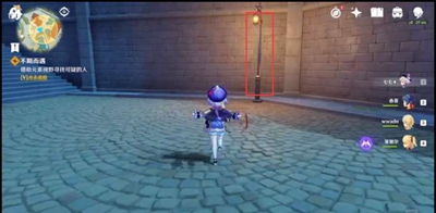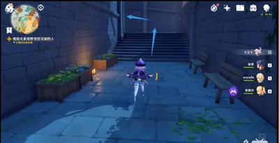具体路线、点击左上角的眼睛,打开元素视野,沿着下图的路线、到达下图的这个路灯位置会出现派蒙对话,她说脚印消失了,让我们往上爬。