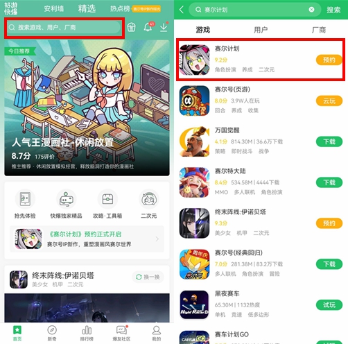 2.打开好游快爆,点击右上角的搜索按钮,输入赛尔计划进行搜索,选择赛尔计划点击预约游戏。