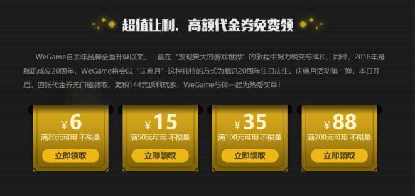 Tencent WeGame(简称WeGame)今天开启“为热爱买单”庆典月回馈行为,平台将拿出本身发行收入回馈玩家助力体验更众逛戏。玩家可领全平台通用满减券,最高满200元减88元。