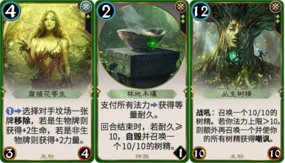 绿色开发出了更多玩转法力的姿势,【腐殖花寄生】竟然可以操控对手坟场(为什么你不是张黑色的牌呢)