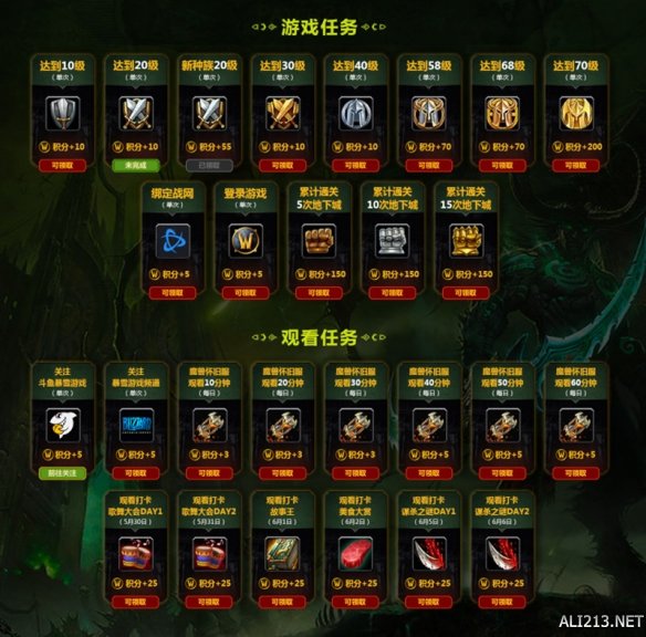 如果您是一个魔兽玩家,每日登录游戏,提升角色等级,畅玩全新种族,都可以获得海量积分;如果您是一个斗鱼水友,每天完成观看任务,打卡精彩节目,关注暴雪游戏频道,也可以获得海量积分!具体任务及奖励积分如下图所示: