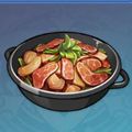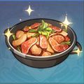 旺火炒制的菜肴。腊肉炒出的油脂均匀地裹在配菜之上,鲜香的风味却早已沁入其中,亮丽的色泽更是激发着人的食欲。只需要一小口,足以让璃月人扬起对家乡和节庆时分的思念。