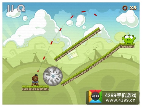 接着直接绕过中间的障碍和滚轮,利用抛物线原来将甜甜圈送进小猪的嘴巴中。