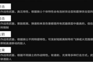 1.脚色军种 下面给专家简述一下逛戏中骑士们的基础性格,蕴涵骑士品种、骑士定位、装甲机型等各方面,便利玩家对战…